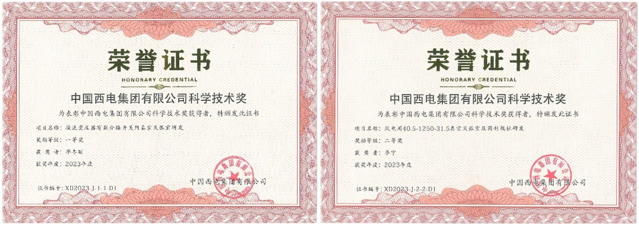 近日,寶光集團所屬寶光股份《換流變壓器有載分接開關用真空滅弧室研發》與《風電用40.5 kV/1250 A-31.5 kA真空滅弧室及固封極柱研發》兩個技術創新項目,分別榮獲2023年度中國西電集團科學技術獎“一等獎”與“二等獎”!