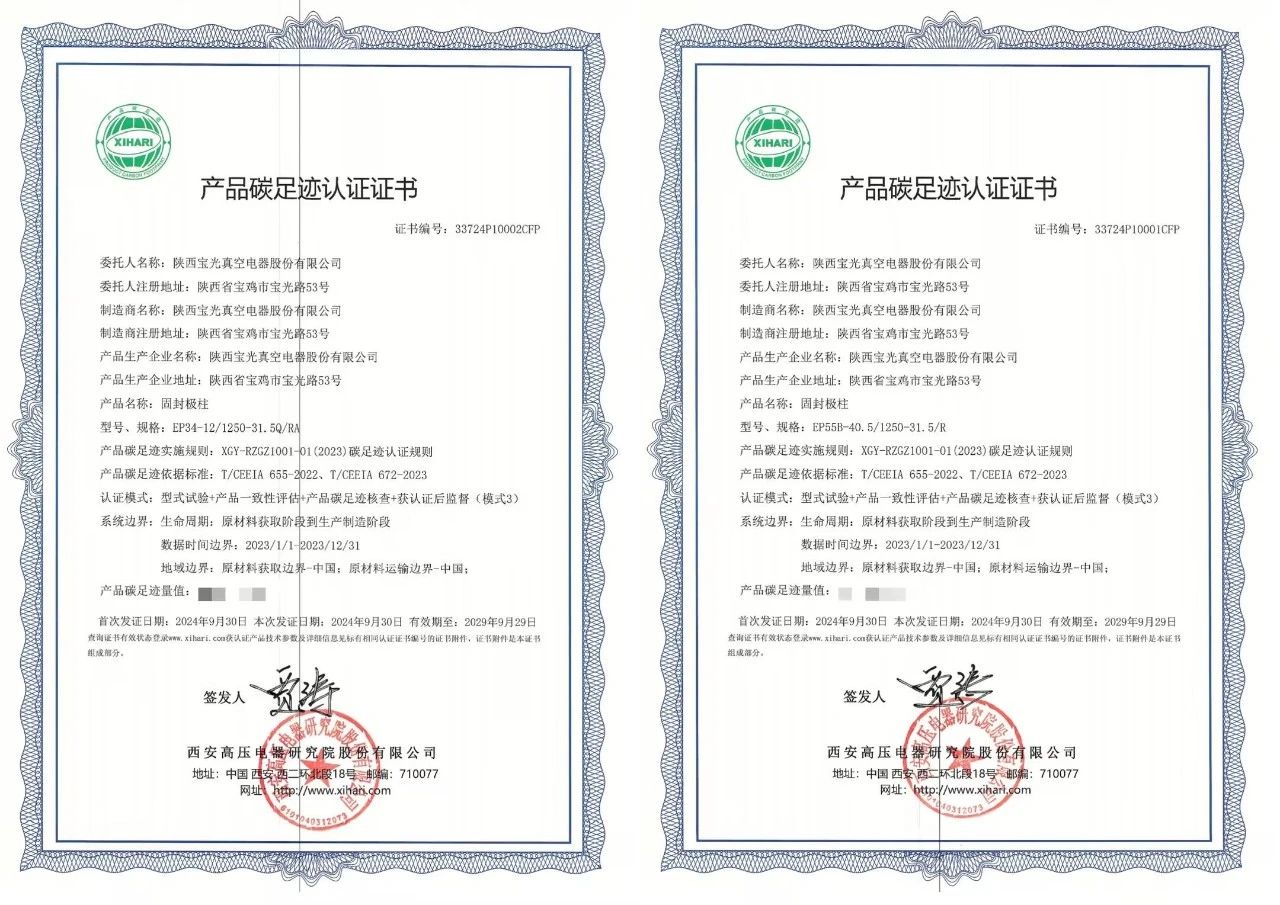 近年來,寶光股份主動探索綠色發展方式,持續披露企業環境、社會及公司治理(ESG)報告,向所有利益相關者展示了自身在環境保護、社會責任和公司治理方面的績效、成就與進展。先后獲得工信部制造業單項冠軍示范企業、國家知識產權示范企業、高端制造產業最具成長上市公司、高新技術企業、陜西省綠色工廠、陜西省智能工廠等榮譽。此次率先在滅弧室行業開展碳足跡認證,標志著寶光股份產品在綠色發展方面走在了行業前列,不僅體現了企業的社會責任,也將持續推進企業可持續高質量發展。